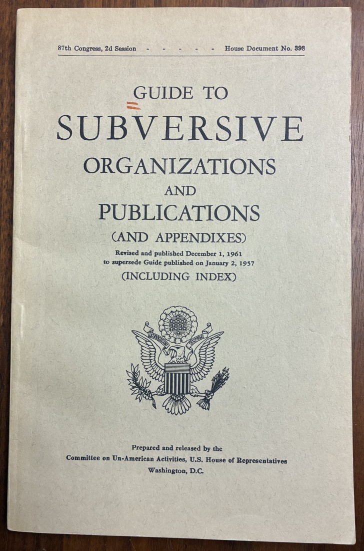 The front cover of the Guide to Subversive Organizations and Publications (and Appendixes), 1961. Call Number: RH WL C601. Click image to enlarge.