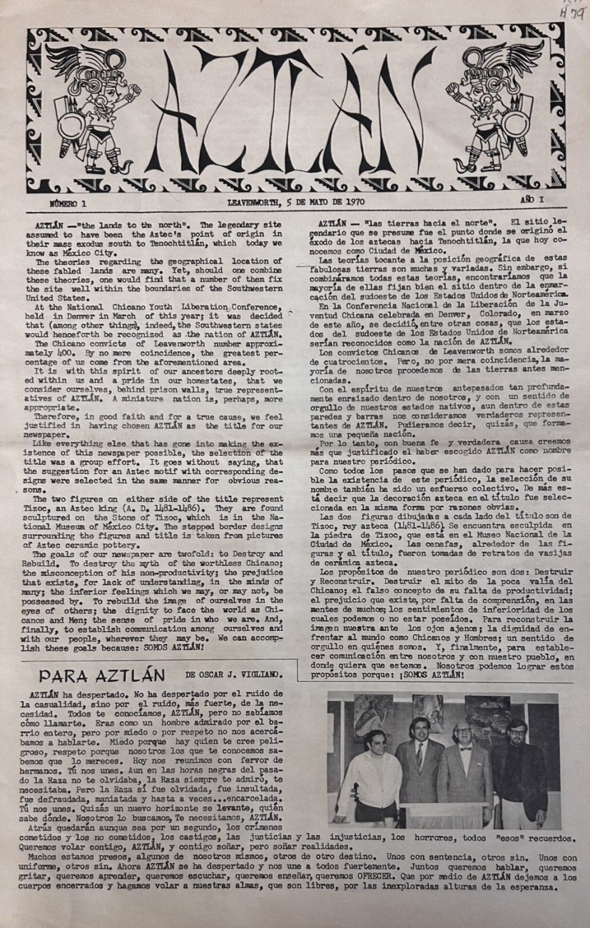 First published May 5, 1970, Aztlán de Leavenworth was a bilingual Chicano prisoner newspaper edited and published at Leavenworth Federal Penitentiary in Kansas. It features poet and activist raúlrsalinas’ famous poem “A Trip Through the Mind Jail.” Other members of the publication team included Albert Mares, Ruben Estrella, Alfredo Arellanes, Ricardo Mena, and Beto Palomino. Inspired by Aztec history and iconography, the newspaper is named after Aztlán, the ancestral home of the Aztecs, and features images of Tizoc and designs inspired by Aztec art.